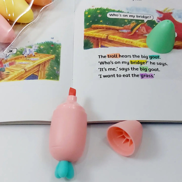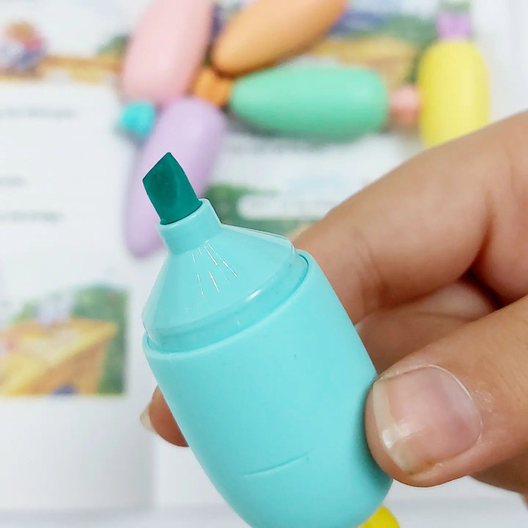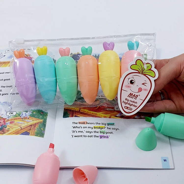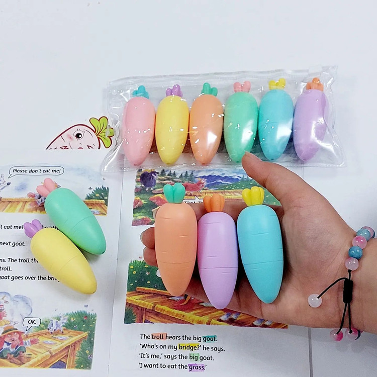هایلایتر هویج کوپلی تو رنگای فانتزی پاستلی سبز،نارنجی،آبی،بنفش،زرد،صورتی رنگاش فوق پاستلی خیلی باحاله وخودم اینکارو خیلی میپسندم پک به همراه زیپ کیف تقریبا ۷ سانتی متر بدنه پلاستیکی