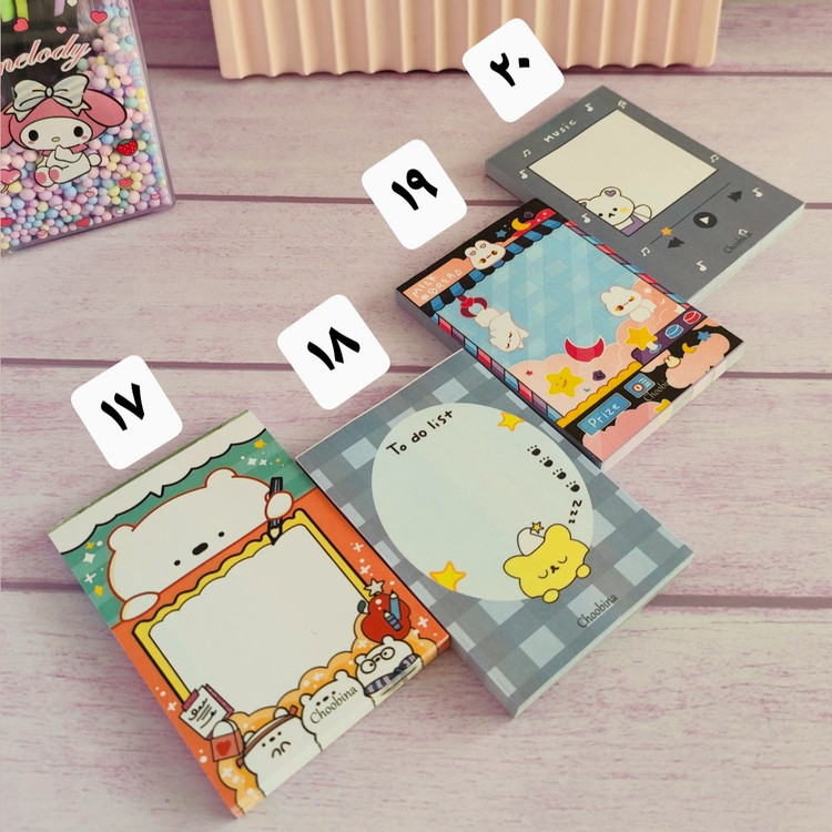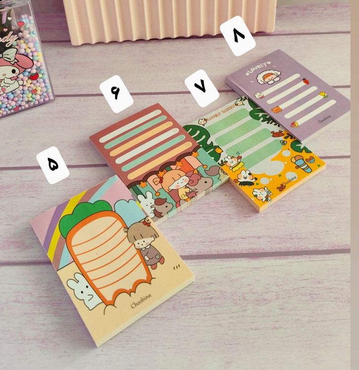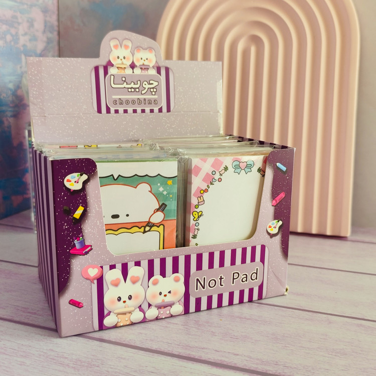 نوت پد چوبینا کد CH 1329 شامل 80 برگ نوت پد فانتزی در طرحهای مختلف، ابعاد هر برگ این نوت پدها 7 در 10 سانتیمتر است.